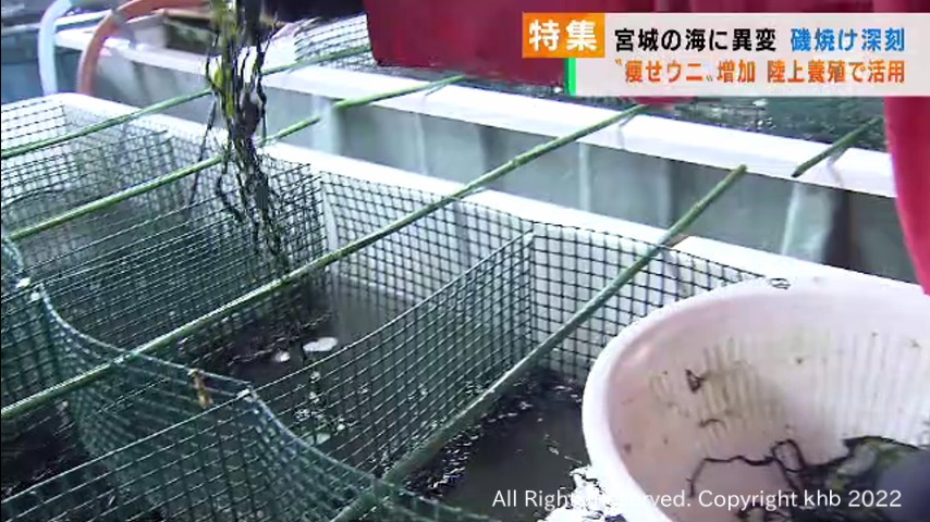 特集は、宮城の海の異変についてです。近年、温暖化の影響で、海藻が減少する磯焼けが進み、餌を食べられずに、痩せたウニが増えています。こうした中、石巻市内で、痩せたウニを活用した陸上養殖の取り組みが始まっています。その現場を取材しました。