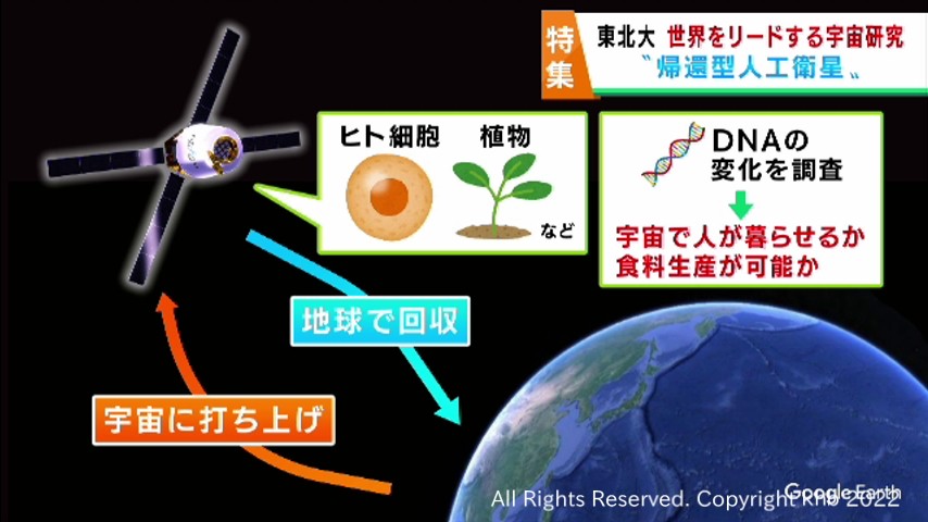 この人工衛星に人の細胞や植物などの検体を乗せて宇宙へ送り、数カ月後に、地球に落下させ海上で回収。検体のDNAがどう変化したかを調べ、宇宙で人が暮らせるかや、食料生産が可能かなどを判断するのに役立てます。