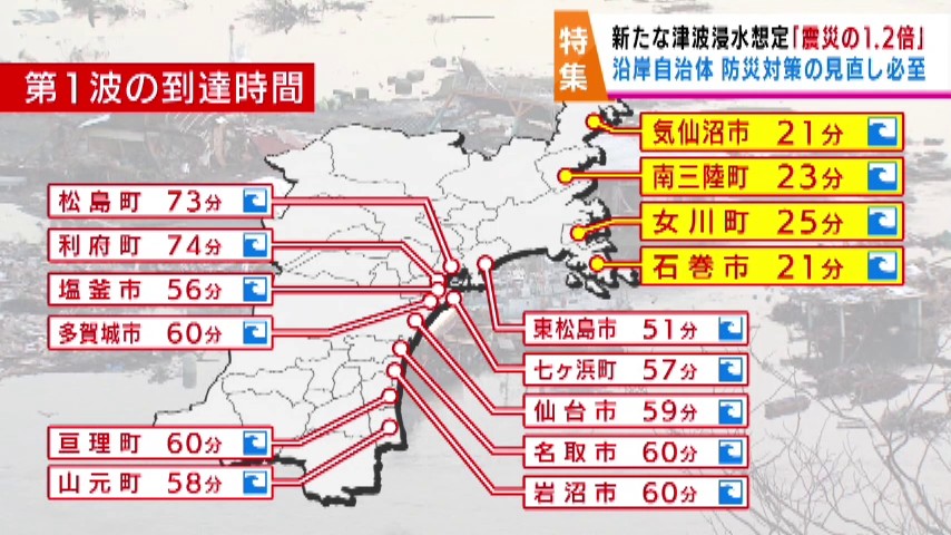 津波の第1波が到達する時間は、気仙沼市と石巻市が最も早い21分。三陸では30分以内に到達し、仙台湾では1時間以内と予測されました。