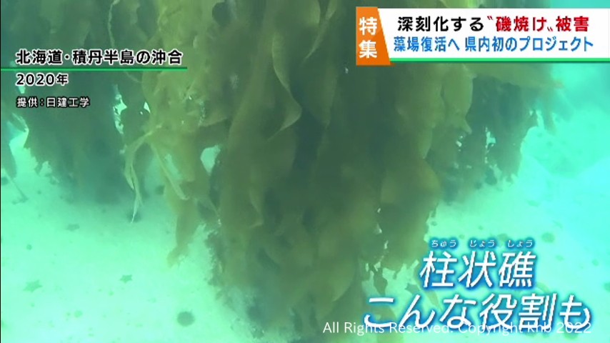 2018年には、海藻が生えていなかった北海道の積丹半島海域に柱状礁が設置され、2年後に柱に沿って生い茂るホソメコンブの姿が確認されています。2022年までに約87.8キロのホソメコンブが育ちました。