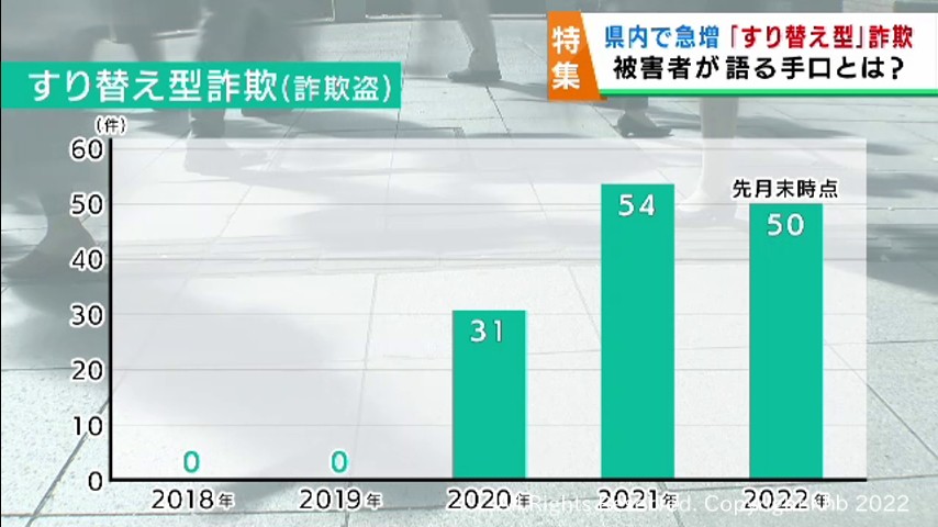 特殊詐欺のうち、最も多いのが架空料金請求で96件、次いで、すり替え型が50件となっています。すり替え型は件数、被害額ともに前年の同じ時期を上回っています。