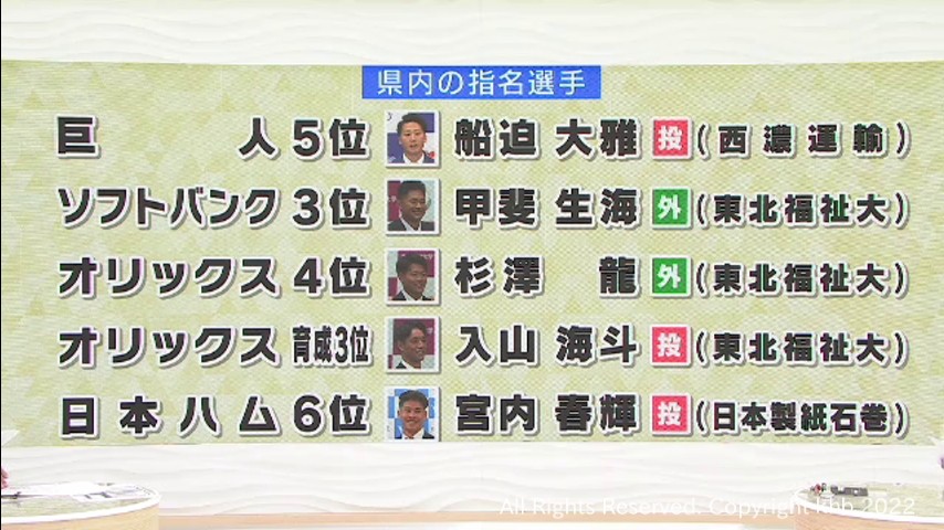 このほか、宮城県で指名された選手です。東北福祉大学からは甲斐選手がソフトバンクから3位指名。