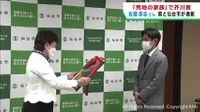 松島町役場で寄贈式が行われ、仙台トヨペットの佐藤秀之社長が櫻井公一町長にアクアのレプリカキーを手渡しました。