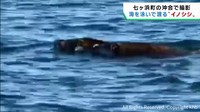 海を泳ぐ2頭のイノシシ撮影 水面から鼻出し器用に水をかく 宮城・七ヶ浜町