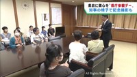 知事の椅子で記念撮影 宮城県政に関心を持ってもらおうと県庁参観デー