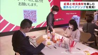 制作した県華道連盟西村一観理事長「ドライフラワーの白と生花の赤という形で、白い世界の中にともしびが灯る。暗いニュースが多い中でも少しでも明かりをともして」