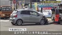 この事故で、バスの乗客1人と車に乗っていた2人の合わせて3人がけがをしているということです。いずれも会話はできるということです。