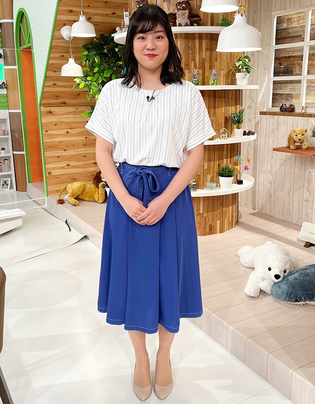 鮮やかなブルーのスカートにブルーのストライプのシャツを合わせました♪ウエストのリボンがアクセント!