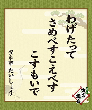 10月に子供が産まれ、嫁ぎ先で子育てをする中での、おっぴおばあさんとの会話を五七五にしました。